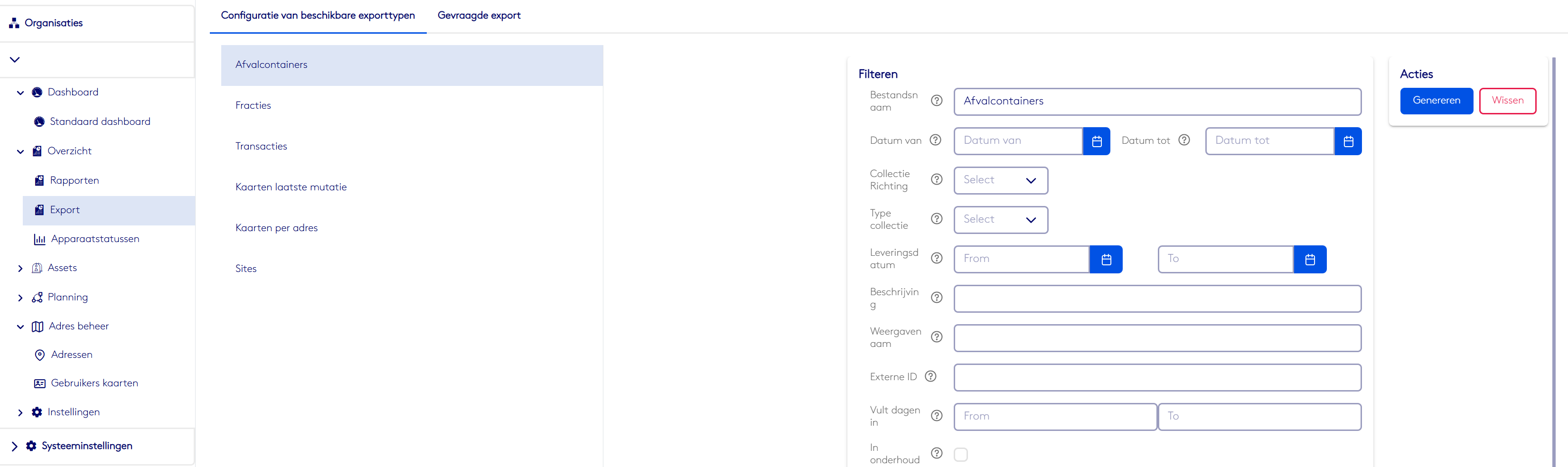 Med Eksport-siden kan du eksportere forskjellige typer data fra systemet. Denne siden gir kundene mulighet til å laste ned data selv for rapportering, analyser eller intern administrasjon.
